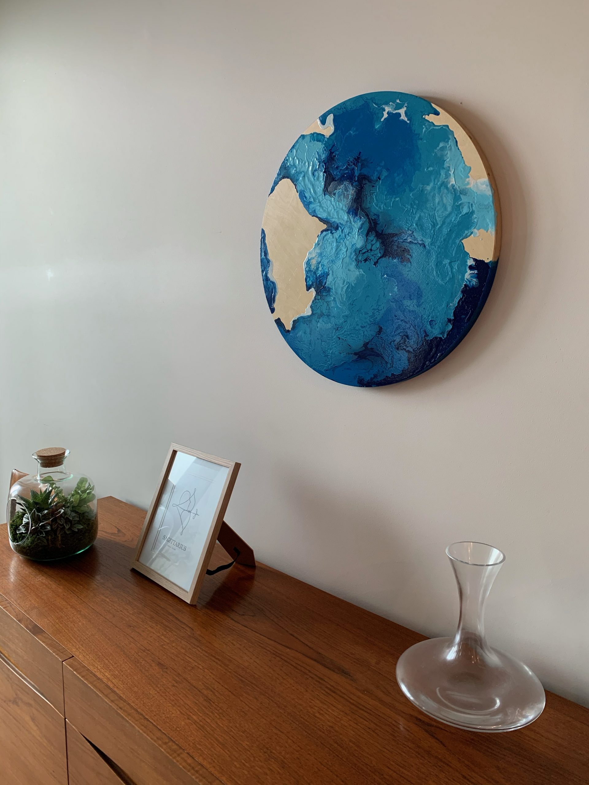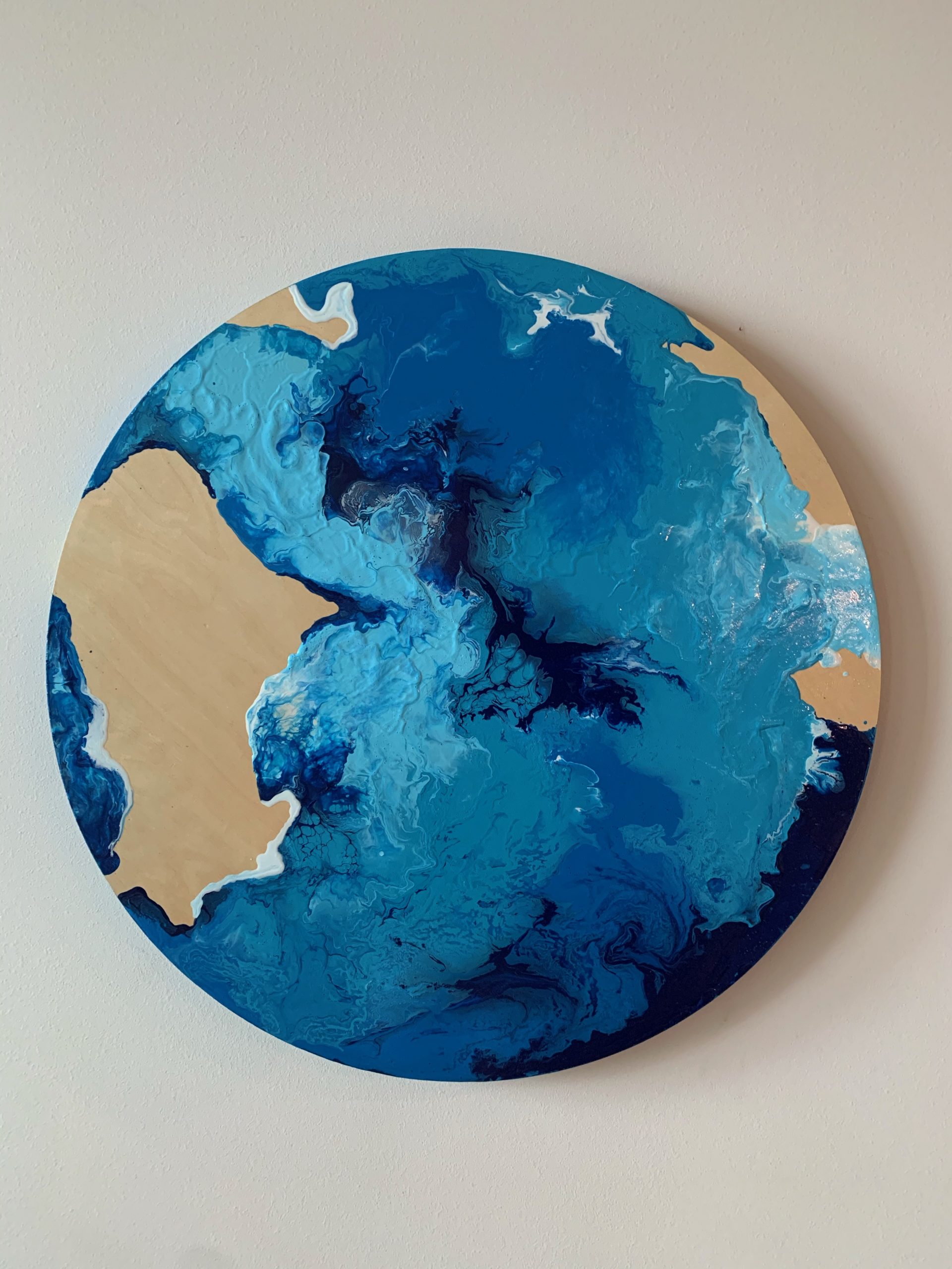 Hand poured acrylic painting on wooden round canvas. Comes with wire string to hang.